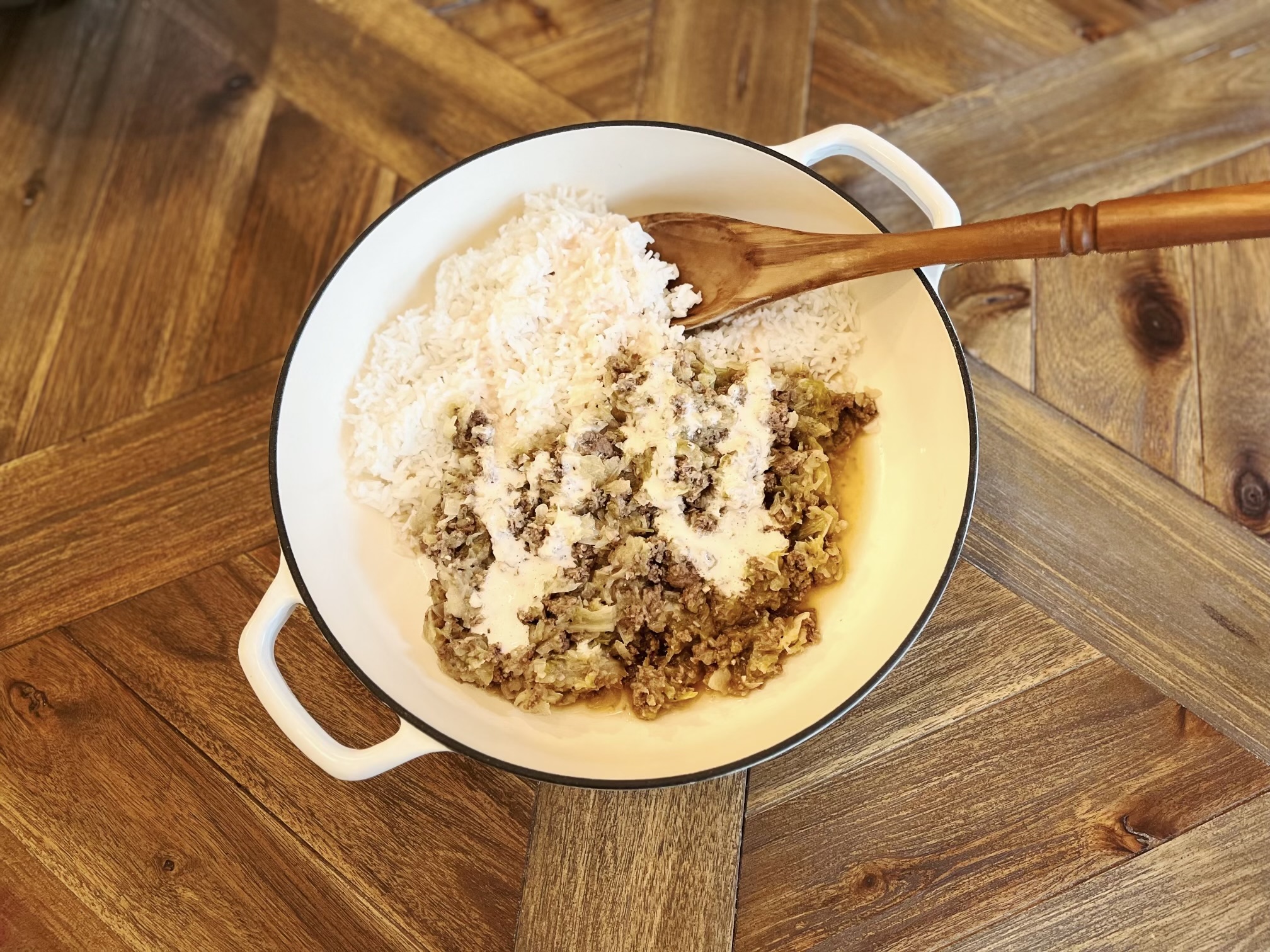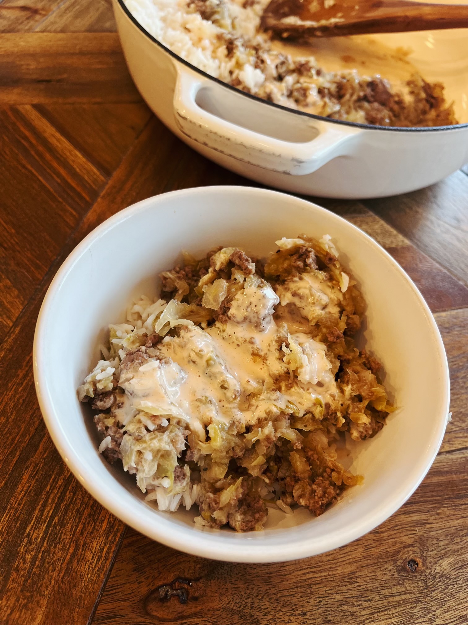 Ingredients: Ground beef, minced garlic, white onion, red cabbage, cabbage, sesame oil, house made chicken broth, liquid aminos, ginger, salt and pepper. (Cauliflower in cauliflower rice option), rice, water, olive oil and salt in traditional white rice option.Â