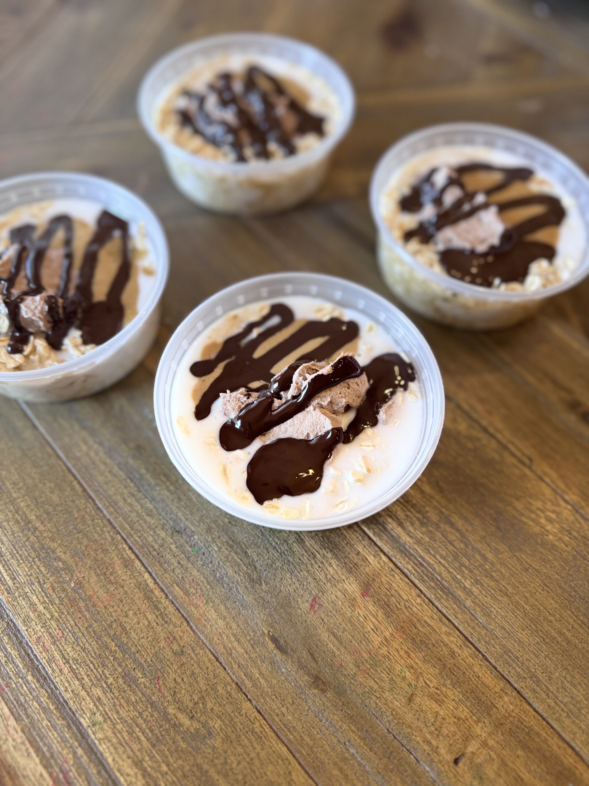 Ingredients: oats, maple syrup, coconut milk, coconut yogurt, peanut butter, chocolate chips, and Truvani protein powder.