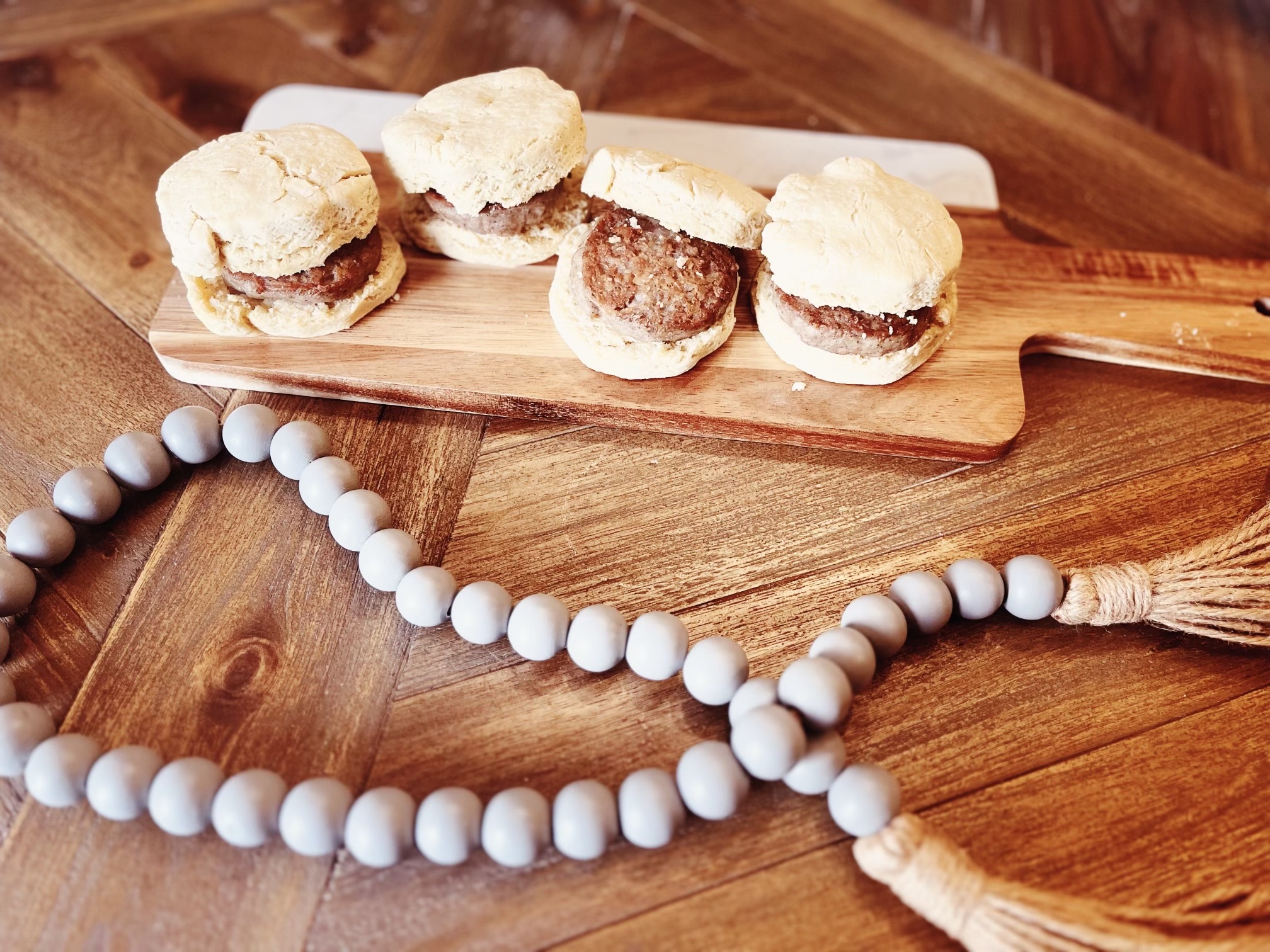 Ingredients: Sausage, organic & unrefined shortening, egg, almond milk, lemon juice, 1:1 gluten-free flour, xantham gum, and baking powder.